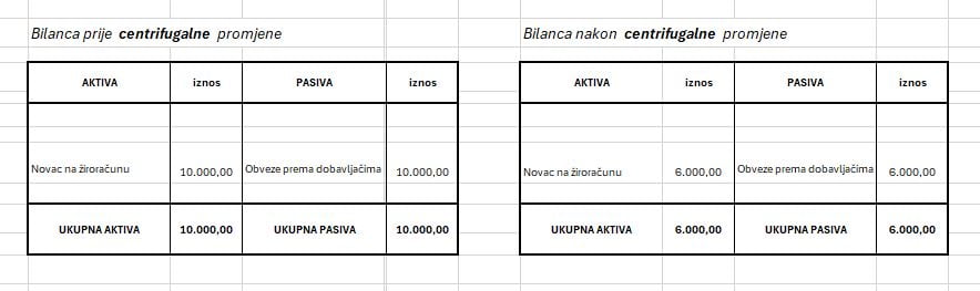 - Centrifugalna promjena – za jednak iznos smanjuju se stavke aktive i pasive. Ukupna aktiva i pasiva su manje.