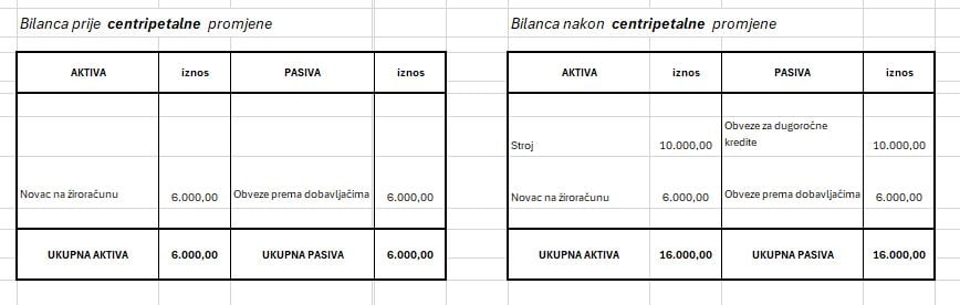 - Centripetalna promjena – pozicije aktive i pasive se povećavaju u istom iznosu što utječe na povećanje ukupne aktive i ukupne pasive.