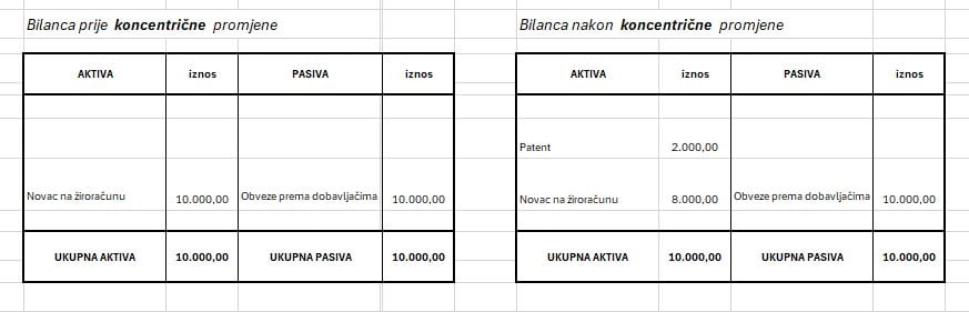 - Koncentrična promjena – promjene koje nastaju samo u aktivi bilance i ne utječu na vrijednost ukupne aktive i ukupne bilance. Uslijed povećanja jedne stavke aktive, druga stavka se smanji.