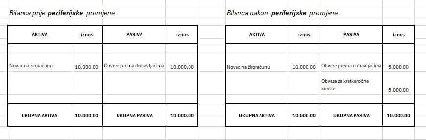 - Periferijska promjena – promjena koja nastaje isključivo u pasivi bilance i ne utječe na vrijednost ukupne pasive i ukupne bilance. Uslijed povećanja jedne stavke pasive, druga stavka se smanji.
